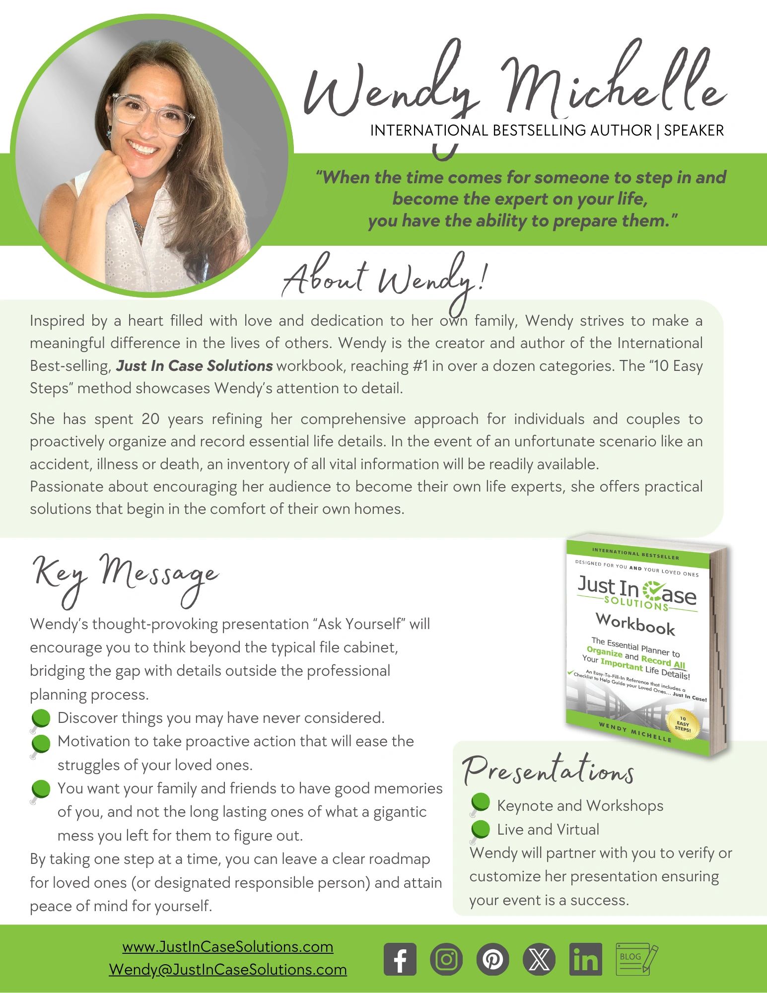 Disclaimer: Just In Case Solutions is designed to provide assistance with the subject matter covered. The author does not provide financial, legal, health, psychological, or any other professional services or advice. If specific advice is needed while organizing your essential life details or while completing this workbook or digital version, please contact a competent professional in the appropriate area of expertise. All services, information, and comments provided on the site are for informational and self-help purposes only and are not intended to be a substitute for professional legal advice.